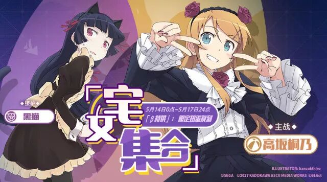 「β特供」:限定扭蛋复刻——「宅女集合!」活动开启! 活动时间: 5月14日0点~5月17日24点 集结而来的「封弊者」们,「宅女集合」主题茶会开始! 准备好与少女们度过愉快的时光了吗? 黑猫(援护)&高坂桐乃(主战) 活动期间,参与茶会的角色限时登场! 错过这段时间就失去重要的美少女了哦! 高坂桐乃(主战 )