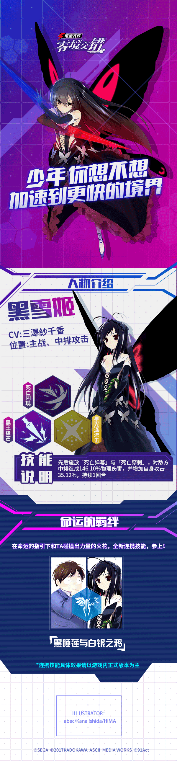 各位「零境使」贵安☆ 关于VR游戏的讨论大家的热情都很高啊 咲久也和大家一样关注着VR游戏哟☆ 说起来 这次咲久为大家带来的角色 也是活跃在类似VR的游戏世界中的哟☆ “黑凤蝶”学姐,黑雪姬登场 《加速世界》的女主角 外表稳重大方 但面对喜欢的人时也会焦躁不安的个性 黑雪姬在零境世界中也同样可爱哟☆