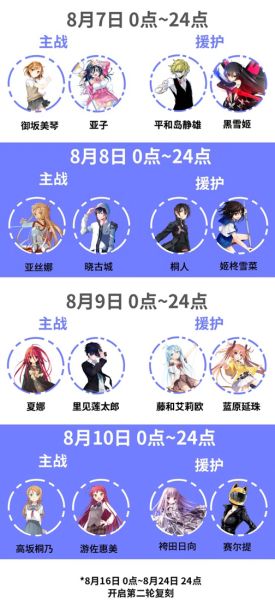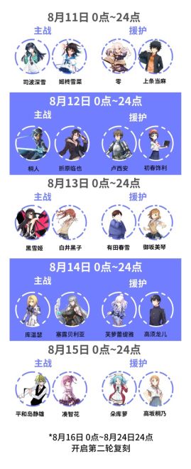 第一轮概率UP时间 2018年8月7日0点~2018年8月15日24点 第二轮概率UP时间 2018年8月16日0点〜2018年8月24日24点 「温馨提示」:每一轮概率UP几乎囊括 全部首发角色 ,两轮概率UP角色顺序相同,错过第一轮还可以pick第二轮~