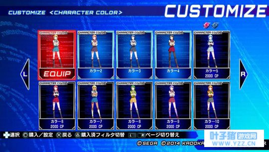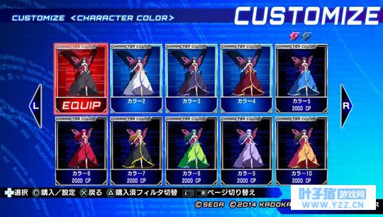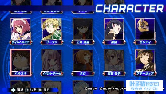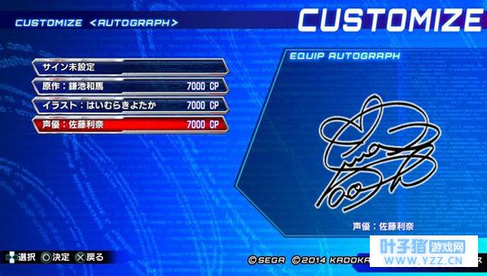 CUSTOMIZE(编辑)模式 在「CUSTOMIZE」模式里,除了能够变更角色的配色外,还能够对对战时所显示的“称号”、“角色图示”、“角色面板”等个人资料进行自定义编辑。自己的角色选择画面还可以显示电击文库的原作者、插画家、以及演出各个角色声音的声优的签名,但这需要用CP点购买。