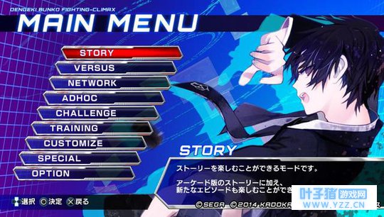 游戏界面介绍 Story模式:体验新加入的剧情 Versus模式:与朋友在线对战的模式 Network模式:通过联网与全国玩家对战 Challenge模式:挑战排行榜高分的模式 Customize模式:换购各种战斗道具 Training模式:对战CPU练习技能的模式 Special模式:还原原作的鉴赏模式