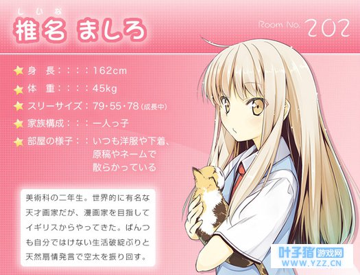 椎名真白-援助 《樱花庄的宠物女孩》中女主角。个性温和,天然呆、有极度的依赖性。完全没有一点自理能力,连内衣裤也是空太挑出来才穿。喜爱吃年轮蛋糕,拥有与常人迥异的思维回路。因为出生于艺术世家,从小便开始学习画画,世界级的天才画家。但对外界的反应迟钝,缺乏生活常识。
