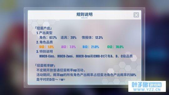 腾讯爸爸也好心,给了保护机制,累计十抽必送紫,这可比某易的良心多了(非酋的怨念)。 这里的角色呢,共有四种品质,c绿,b蓝,a紫,s橙(莫名想起了炉石),好坏大家都明白,就不在一一细数。爆率如下