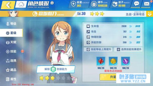 【技能升级】 升星的主要作用是能提升技能等级的上限。零境使打开技能切页,花费一定硬币即可升级技能。技能升级后还可提升连携技能的伤害,连携双方角色的技能之和越高,伤害越高。两人出击,伤害爆表!角色星级决定角色技能等级上限,角色升至两星需要5级,升至三星需要20级,升至四星需要35级。