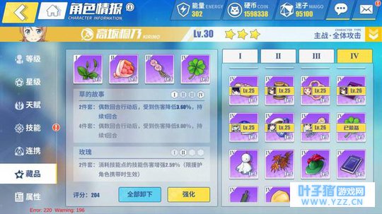 【携带藏品】 角色携带收藏品之后,能力可获得大量提升,提高角色等级才能穿戴品质更高的藏品哦。藏品分为Ⅰ、Ⅱ、Ⅲ、Ⅳ类,表示四种可穿戴的藏品类型。藏品可通过商店购买,通关剧情副本会随机掉落收藏品,通关挑战模式也会掉落强力藏品,挑战模式爬塔的难度越高,掉落的藏品质量越好,属性越高。另外,藏品还可以进行强化,品质越高的藏品,强化可达到的等级上限也越高。