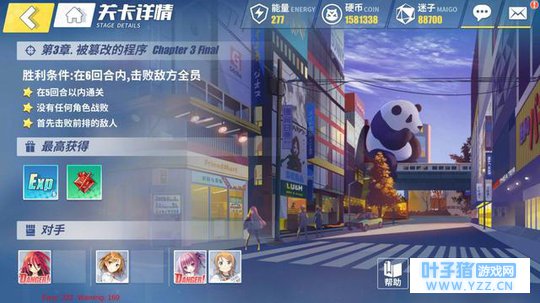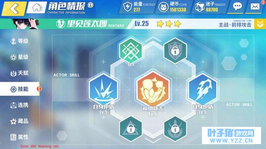 角色的血量与防御属性(例如异能防御和物理防御)需要依靠装备效果、角色等级、星级和天赋来提升。除此之外,援护角色也会为主战角色提供生命、防御等方面的属性加成,而且还会为主战角色额外提供一个技能。不同的援护角色,所提供的技能在战斗中产生的效果也是不同的。 【主战角色】 主战角色分类:前排、中排、后排、全体伤害、治疗、驱散、净化、群体增益和给予敌方负面状态。 给予负面状态的分类有:控制封锁、攻击力衰减、驱散、防御力降低、血量每回合降低等。区分前排、中排和后排输出,是为了顺利完成有三星任务的关卡, 比如优先击杀后排、清除己/敌方的特殊状态、在6回合以内通关等,这就需要玩家们选择对应的角色(一些角色的技能专打中排或后排)和各自的技术来通关了。