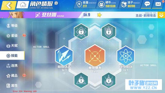 【主战角色举例】 主战-亚丝娜技能属性分类于前排攻击,极速突刺和四重痛楚可对敌方前排造成百分比物理伤害,四重痛楚还会额外增加攻击力持续1回合。而圣母圣咏在对敌方前排造成百分比物理伤害的同时还会提升50%暴击率。