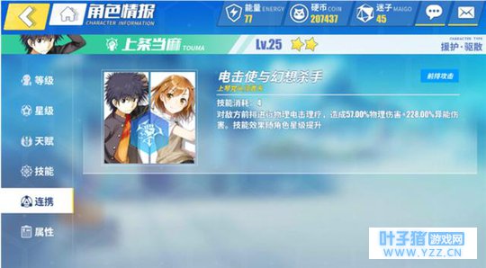 当玩家完成角色连携中御坂美琴与上条当麻这两个角色的队伍搭配之后,就能够激活"电击使与幻想杀手"这一连携技。每次释放这一连携技的时候,都需要消耗4点技能值。能够对敌方前排进行物理电击治疗,造成57.00%的物理伤害+228.00%异能伤害。