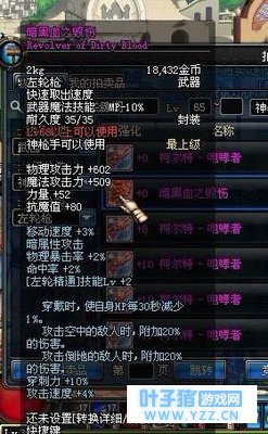 这把武器是我知道的第一把武器,也是地下城比较出名的一把武器,这把武器是很多玩家梦寐以求的装13的炫酷武器,当年爆率真是低到令人绝望的地步,当年站街(站在街上给别人展示)必备的武器,回头率超级高。因为每个区的拍卖会价格不同,但是当时的售价都在两到三亿不等。这把武器的亮点除了它炫酷的外形外,还有很多的技能加成,所以卖出的价格也是很高的。 暗黑血之毁伤