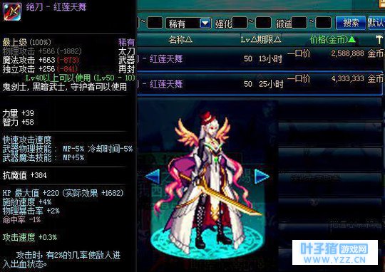 这把武器的附加属性里加了一级红眼的暴走技能并且是冰属性攻击,这两样属性使这件装备的价值即便在60版本也是十分可观的。这清爽的蓝色再加上与之相配的冰属性,令多少红眼玩家心驰神往。 血莲鸣凤剑