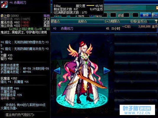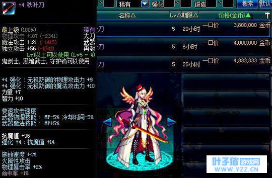 秋叶刀,5级紫装太刀。火属性攻击,俗称小流光刀,想当初玩红眼的时候 ,做梦都想买一把流光星陨刀,可惜当时穷的叮当响,没办法只能买吧秋叶刀过过瘾了。没想到几年之后这把刀的价格居然远超流星落,真的是造化弄刀啊!