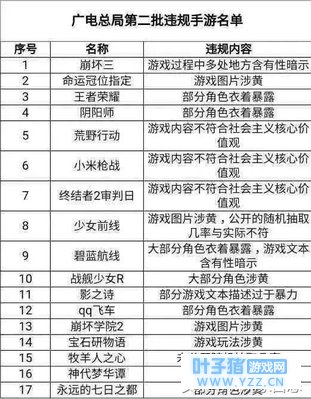 同时在广电总局的第二批违规手游名单中“崩3”“王者荣耀”“阴阳师”等大型游戏也是一一上榜。