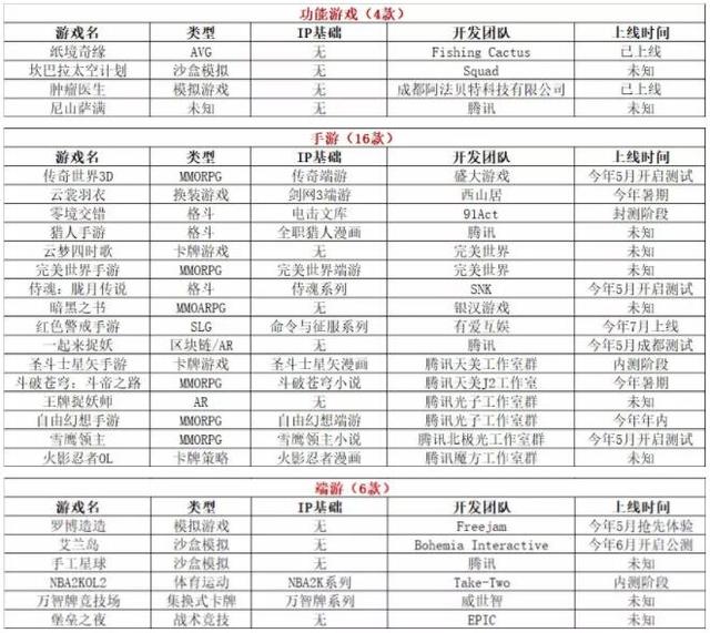 整体来看,今年的UP大会的游戏发布环节依然充实,并且腾讯经历了多年探索之后,也将泛娱乐升级成了新文创,在IP价值的挖掘上更进一步。 但是,一切欣欣向荣的背后,腾讯对游戏的焦虑却愈发明显。 新游戏减少了11款,腾讯的“游戏荒”来了?腾讯在今年的UP大会上公布了4款功能游戏、16款手游和6款端游,总共26款游戏。以下是这些游戏的信息汇总: