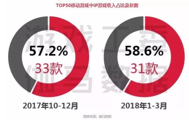 游戏工委&伽马数据发布的报告当中,专门对IP移动游戏的情况作了统计。报告指出,2017年Q4和2018年Q1两个季度,在TOP50的移动游戏里IP游戏的收入占比均超过了57%,游戏数量则占了60%以上。 由此可见,从2015年借助优质IP的手游开始爆发之后,哪怕已经过去了3年时间IP游戏依然是手游市场发展的主要推手。