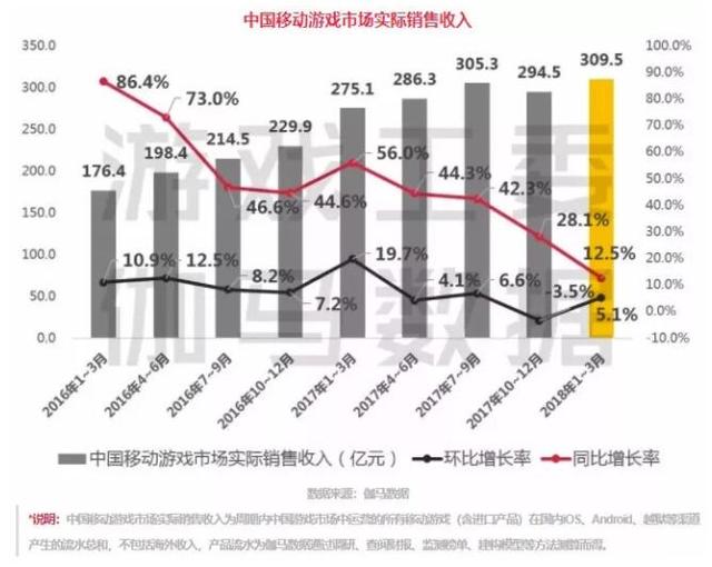 2017年中国游戏用户规模增长率仅为3.1% 根据前不久游戏工委&伽马数据联合发布的《2018年1~3月移动游戏产业报告》显示,今年Q1中国移动游戏市场实际销售收入为309.5亿元人民币,虽然环比有所回升,但同比增长仅仅只有12.5%,远低于2017年Q1的56%。