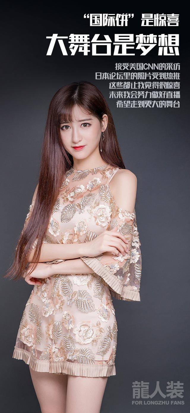 4)美国CNN曾经采访过你,你的照片被放到了日本网站上,受到了日本网友的喜爱。你也被粉丝们称为“国际饼”,那么未来有没有想法进军国际? 正好那段时间人气比较高,所以很幸运能够被美国CNN采访,再一次了解到说好英语的重要性。日本论坛里粉丝上传了我的照片,得到了很多人的热推,这也让我觉得很惊喜。未来的规划我觉得还是要在直播做好的基础上更加增强自己的商业价值,如果有机会走到更大的舞台,那我也一定不会给龙珠丢脸,我会争取越来越好。