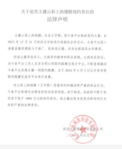 除此之外,在五一时,又有一位主播跳槽到虎牙。这位DNF人气主播本是斗鱼DNF区的人气王,如今跳槽到虎牙,想必虎牙一定是给了他高额的价格。如今云彩上的翅膀主播因为违约,又将面临高额的违约金,真的是一波未平,一波又起呀。