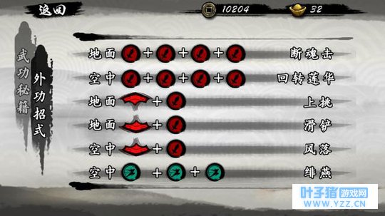 本作的操作简单方便 ,十字键控制移动, 攻击搭配十字还有不同的招式, 当然也有跳跃、闪避和技能按键, 人物血条下面的火型图标就是技能释放的次数 在充足情况下,可以 实现无CD的无限连 打起来非常爽快,当然对游戏的操作也有一定要求。 游戏分为内功和外功,外功还有专门的出招表 每个都有招式的名字,或者秘籍的名字 不过秘籍的取得方式除了关卡获得就 只有元宝购买了 许多招式有连携效果,一起组成各种华丽的连击吧。