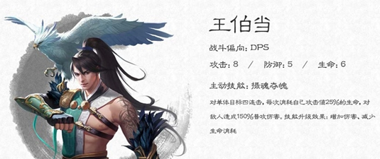 王伯当 战斗偏向:DPS,属性:攻击:8 /防御:5 / 生命:6。 主动技能:摄魂夺魄,对单体目标四连击,每次消耗自己攻击值25%的生命,对敌人造成150%普攻伤害。技能升级效果:增加伤害、减少生命消耗