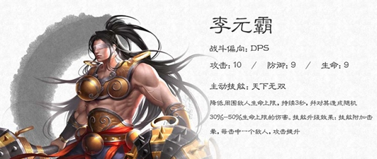李元霸。 战斗偏向:DPS,属性:攻击:10 /防御:9 / 生命:9。 主动技能:天下无双,降低周围敌人生命上限,持续3秒,并对其造成随机30%-50%生命上限的伤害。技能升级效果:技能附加击晕,每击中一个敌人,攻击提升 [编辑:叶子猪小秘书]