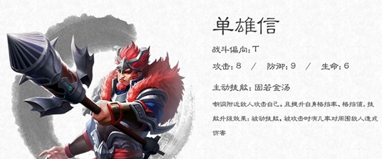 主动技能:固若金汤,嘲讽附近敌人攻击自己,且提升自身格挡率、格挡值。技能升级效果:被动技能,被攻击时有几率对周围敌人造成伤害