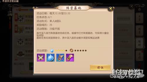 活动时间: 每天12:00至23:30 活动形式:单人&组队 奖励阅历:25 活动限制:20级开放 每天深入敌方阵营基地完成任务、或镇守己方阵营基地,可获得大量经验奖励 基地任务均完成奖励禁地领,其他深入敌后会额外奖励军械运送票。 活动将:声望、经验、禁地令、军械运送票 阵营基地寄存说明: 1.如果前一天没有挖后才能基地任务(深入敌后或基地镇守),则今天获得经验值*1.9 2.如果钱两天没有完成,则今天获得经验值*2.8 3.最多寄存两天 玩家们赶紧参与到阵营基地,为你的阵营做出贡献吧。 [编辑:叶子猪小秘书]