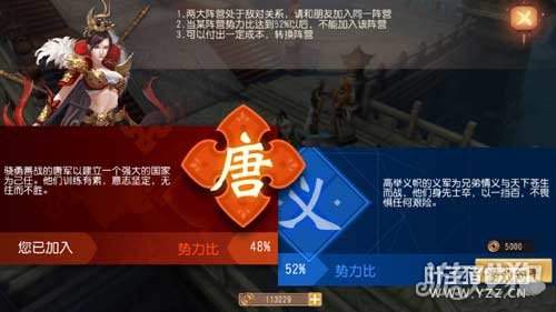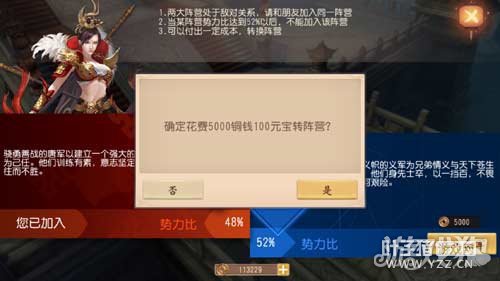 小编在之前加入的是唐军阵营,所以在显示上,就有加入义军这个选项。点击可以看到加入义军阵营需要花费5000铜钱和100元宝,进行阵营转换。费用不是太高,但是有一定是需要注意的,换了阵营之后,你就会推出帮会,因为敌对阵营的玩家不能加入敌对阵营的帮会。 [编辑:叶子猪小秘书]