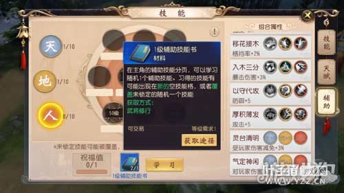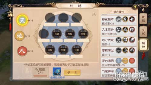 天赋技能分为天地人三档,每个有10个技能,需要等级达到55级之后才能全部开启。辅助技能可以通过辅助技能书来获取,进入到辅助技能界面之后,点击下面的学习按钮,就可以学习辅助技能。但是辅助技能的学习是随机的,可能覆盖已有的技能。