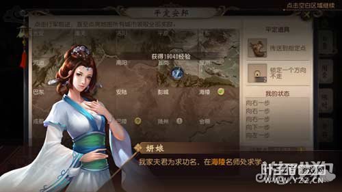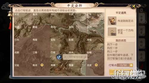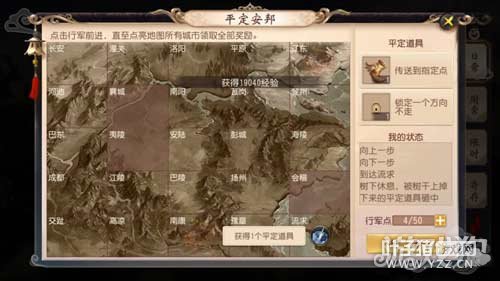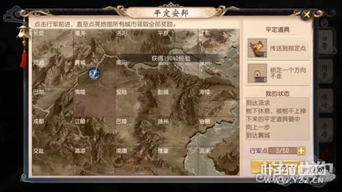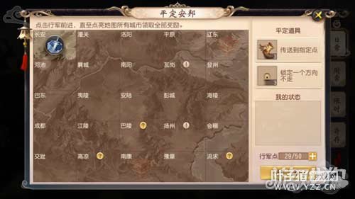 没看错,这就是平定的界面,一共二十五个城市,第一次进入可以获得经验,也会有随机事件(图中问号,奖励行军点,获得道具,debuff等等),寻访任务(图中感叹号,接取后需进入指定城市,获得高额经验),平定宝箱(图中紫色箱子,活得游戏道具等等),开始前先了解地图,看看寻访任务的完成条件,尽量少走冤枉路。 有人要问了,如果直接走地图,那还要挂平定干什么,当然是挂必需的行军点(右下角),每挂一轮会得到一个飞鞋(0行军点飞往任意城市,最好用的道具,珍惜),随机还会获得锁定道具(封锁路线,但同时只能生效一个,必要时使用)。按照我的经验,基本有30左右的行军点和三个飞鞋就够用了。下面具体给大家显示我的29步行军过程。
