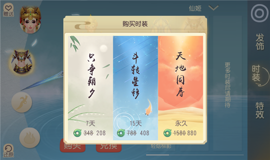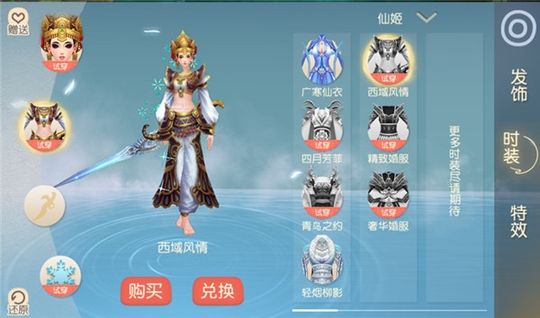“西域风情”时装和发饰可通过珠玉、锦缎兑换或者直接购买获得。7天、15天、永久的购买价格分别是208仙玉、408仙玉、880仙玉,包括了时装和发饰,少侠们赶快行动起来买买买吧!