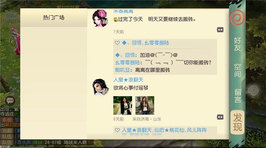图6:《大唐游仙记》朋友圈发状态 值得一提的是,发布状态时还可以定位城市,认识同城好友更是轻轻松松,也许你的游戏女神(男神)刚好和你一个城市呢!热门广场精选每日热门状态,还有更大更有趣的世界等着你。