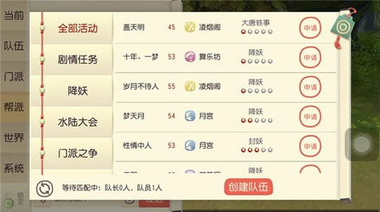 图1:《大唐游仙记》 【快捷组队,轻松撩妹】 都说固定队伍是培养感情的最佳场所,《大唐游仙记》作为一款MMO手游,有大量的活动玩法需要与队友联手结盟、共同作战。值得一提的是,《大唐游仙记》为玩家们提供了十分便利的快捷组队方式。轻轻一点,所有的队伍情况展现眼前,玩家可以各取所需,根据自己想做的任务选择队伍加入。