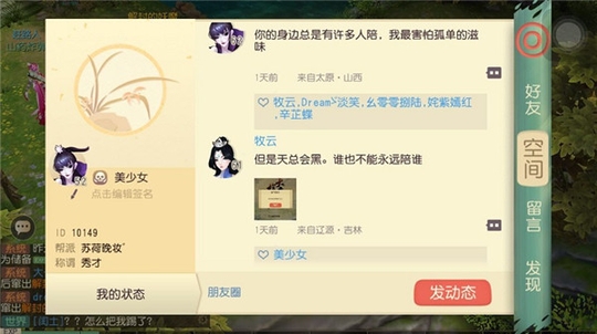 图5:便捷语音聊天 【真人社区,点赞留言媲美朋友圈】 《大唐游仙记》推出空间和状态板块,打造真实、实时的互动社区。玩家可以随时随地发布各类文字、图片状态,给其他好友点赞、评论。聊游戏,聊生活,像朋友圈一样热闹!