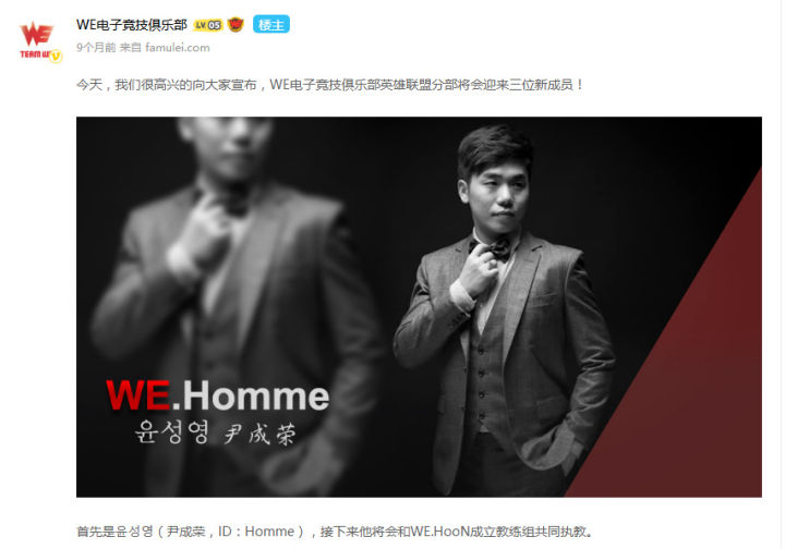 Homme的大名在LOL圈子应该无人不晓,S4无敌的SSW就是出自此人门下,之前也在OGN两次夺冠,鼎鼎大名的三星王朝掌门人。虽然在VG的2年成绩不甚理想,但也有人员组成俱乐部经营策略等多方面的原因在内,否则S5的时候LGD也不会让他以个人身份协助战队了。 同时在当时一个不起眼的选手一起加入WE: