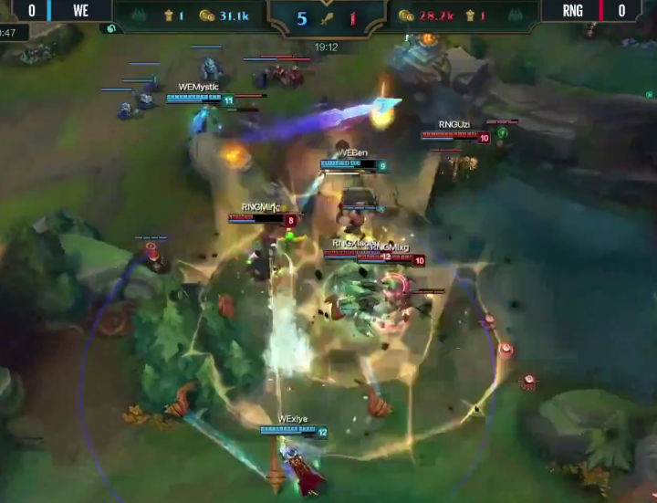 吃了河豚残血的UZI被迫闪现后退,RNG已经没有守塔资格,向高地撤退。而此时TP下来的兮夜却不依不饶,先是WE连招捆住撤退中的UZI,然后直接闪现REQ秒掉UZI!!!万军丛中取上将首级!!! 至此WE众将一马平川踏破RNG敌营,一波破掉中军,拿下第一局的胜利。