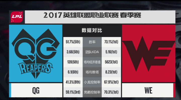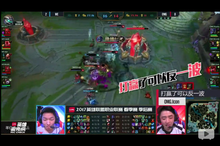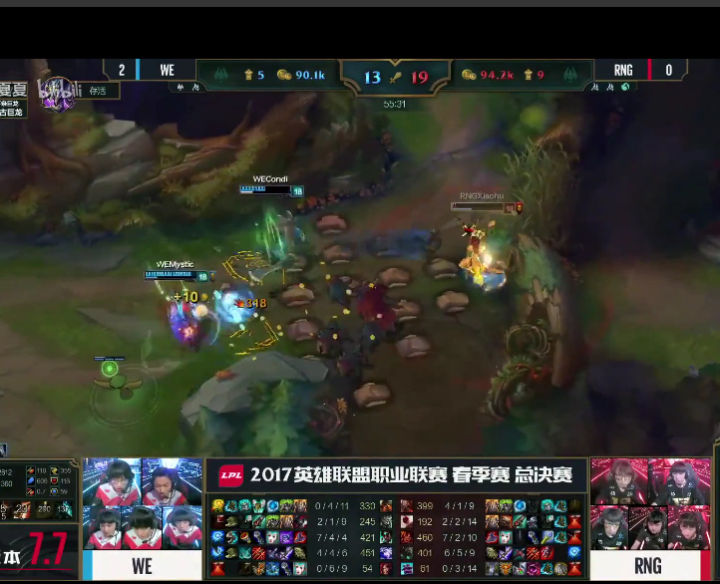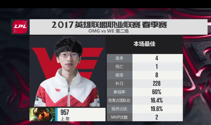 WE携带碾压数据回到同组对抗,却找到闷头一棍,先是0-2输给QG结束连胜,然后在与老对手的对抗中再次输给EDG,最终春季赛常规赛分别被QG和EDG两次战胜,与EDG战绩同为12-4,而幸亏最后一轮NB以1比2输给EDG,让WE以小分优势占据小组头名,直接进入半决赛。 常规赛中WE表现出来的实力足够强大,但暴露出来的问题也足够明显。 说WE节奏慢吧,WE往往从10~15分钟就开始发力,20分钟建立优势,然后携带者巨大的运营推塔或者龙BUFF直接一波快速结束比赛,场均结束时长33分钟在LPL排名第二,仅次于RNG,这绝对不是一个慢节奏的队伍。 但如果说WE节奏快吧,WE往往在开局前10分钟很少有动作,而且面对一些前期套路比较多,打野GANK比较凶猛的队伍,10分钟可能就陷入劣势,而如果对方滚雪球能力足够,可能20分钟不到还没等到WE运营就已经被打崩了。比如打EDG的时候以及RNG的第一局,还有第二局的开局。 所以WE的习惯性节奏就是前10分钟稳住,线上稳定进入6级,打野有效的反蹲或者跟着辅助入侵视野,保证队伍的发育,然后凭借带着大招和装备初步有战斗能力的中路上路开始带节奏。而一旦打野反蹲失败无脑入侵被抓,或者xiye和mystic上头,WE就会陷入劣势不得不将比赛时间拉长保证C位的发育,或者等待上单有一战之力。 而两个C位不时上头的结果就是957作为上单要拿出输出英雄就会非常危险,可能还没有打出效果就必须站出来参团了,于是只好选择肉装来保证团战成功率。当然好处就是,只要双C或者打野有两个人正常发挥,就等于拥有三个轮流CARRY的C位。 当然这也受益于春季赛版本理解能力很高,并且非常善于与打野一同进行游走入侵眼位的新辅助ben,在这个AP辅助的版本,ben能够快速建立线上优势然后让ADC单独发育,自己游走帮助打野是春季赛WE前期节奏的一个重要保障。同时进攻性打野的版本也正好契合了condi的英雄池,否则WE就要回归去年那样的拖后期决胜的磨屁股比赛了。 进入季后赛,WE在半决赛迎来了本赛季后半段发挥出色的OMG。但说实话此时的OMG虽然凭借着World6与中单Icon的激进表现颇有乱拳打死老师傅的风采,面对WE这种稳定的运营队伍机会真的不大。果然BO5的比赛很快以3比1结束,而且其中OMG获胜的一盘还是WE以优势局面急于一波而被对方在基地下团灭反一波了,否则会是一个完美的3比0.