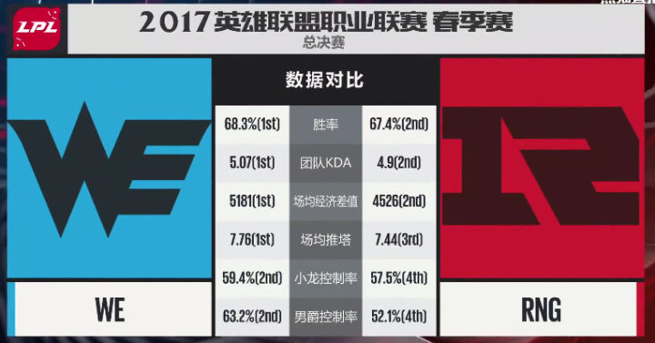 但如果抛弃过去的既定印象而来看两队本赛季具体表现,你会发现WE整体发挥明显略胜RNG,并且各个位置逐一对比都没有任何一个点落下风。作为一个WE粉丝,如果告诉你我的赛前预测的话,我会告诉你,决赛没有遇到EDG,我就已经有了7成的信心。