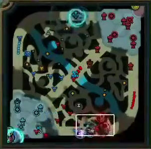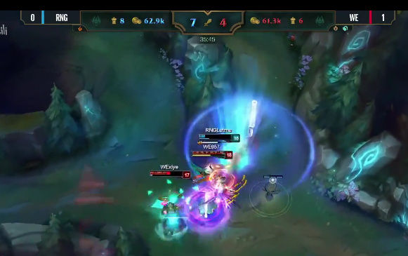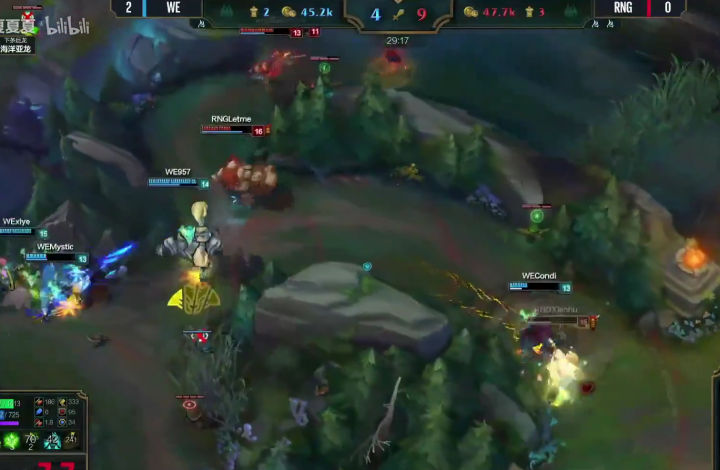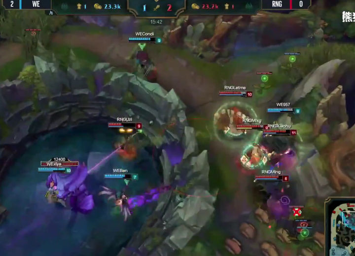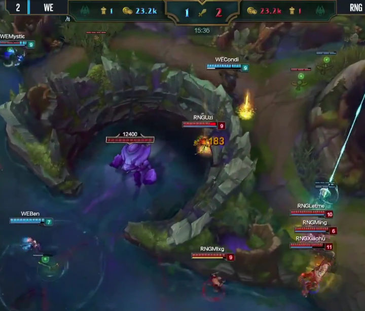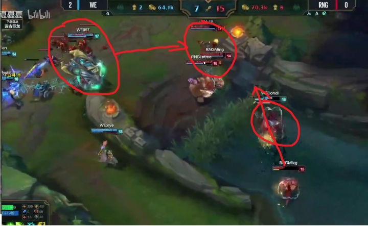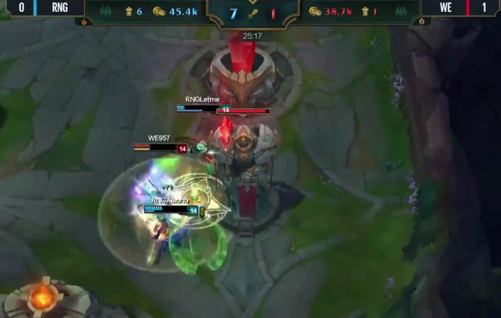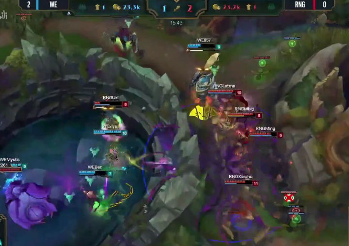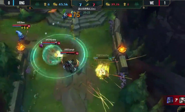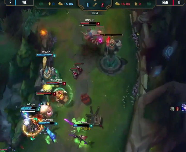 八分钟RNG率先换线,很显然女警前期压制寒冰速推塔的战术在线上没有达到效果,于是小狗强行换线要推上路塔,利用女警手长优势快速积累塔的数量,寄希望于用塔的经济度过前中期,然后利用加里奥的机动性全场支援,拖到后期打团。但是这个战术没有成功,上路抓957的时候WE支援同样出色,轻松化解这次一触即发的团战,RNG不到在十分半钟双人路被迫回到下路,大舅子追着小狗回到下路继续对线。