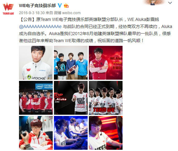 而在WE坐了一年冷板凳的秋名山车神aluka,因为新任上单957的稳定发挥苦等不到机会,也终于选择在合同到期后离开WE,加盟IG的守望先锋战队,这位从PE时代就在WE效力的老将终于也结束了自己的LOL职业生涯。