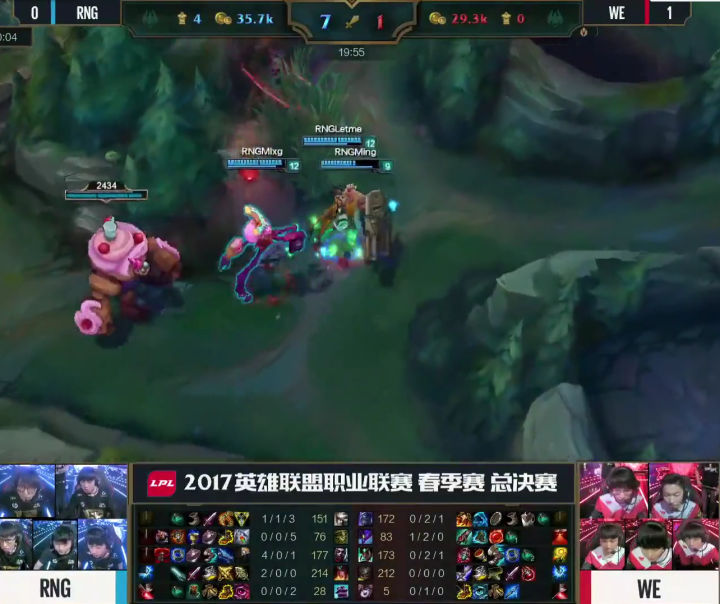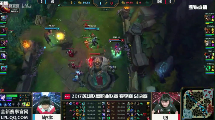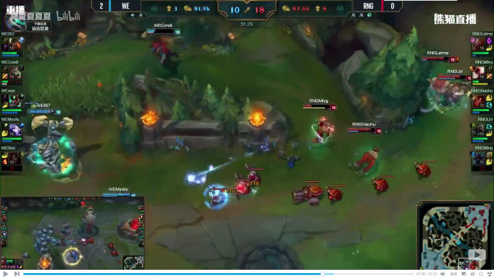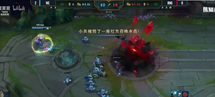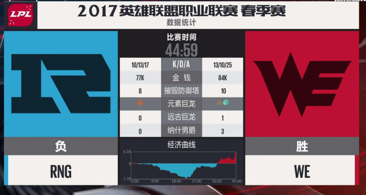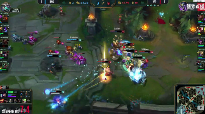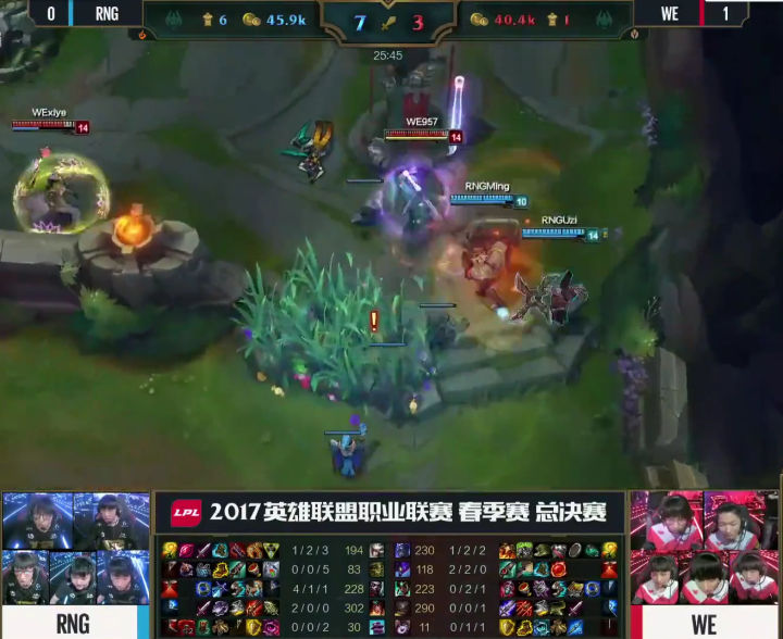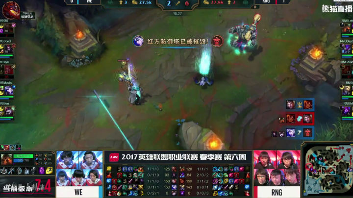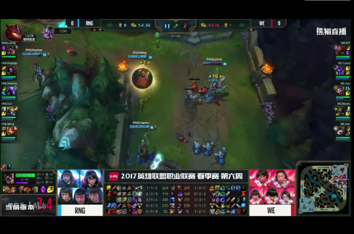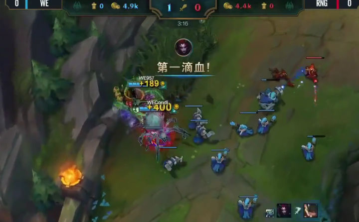 RNG也的确打出了这个阵容前期的压迫力,补刀20分钟人头比七比一,五千经济差,上中两座外塔。之前说过,这两支战队是春季赛场均时长最短的战队,但前期来说两个战队比赛有着明显的差异,RNG是一直前期不断寻找线上节奏,用小团战的战斗方式滚雪球建立优势的队伍。而WE却是用兵线和下野联合推塔拿经济建立优势的队伍。 可以说本局比赛RNG完美的发挥了自己的前期特点。当然这也和四BAN打野逼迫condi选择了螳螂这种前期刷刷刷的英雄,完全没有节奏有关。前期这个差距,已经证明了阵容的正确性,之后就看队员发挥了,所以看到很多人说RNG教练BP失误要背锅的同志我不知道是怎么看的比赛。20分钟接近六千经济差,双C肥的流油,如果这种阵容和战术都打出来了,输了还是教练的BP的问题吗? 其实至此,我以为WE已经凉了,不是因为经济,而是中路一塔丢了。前面我说过,中路一塔是ADC补发育的重要阵地,线短跑路快,队友支援也快,对野做视野也容易。中路塔一丢,野区全黑,边路发育就相当于在危险的黑夜中点着火把召唤别人来杀你,队友还在十万八千里,归家之路遥遥无期,哪怕躲在塔下都逃不掉被越塔或者眼看着边路塔被一点点磨掉。 但是,我不得不说,优势浪不是WE的问题,RNG也同样有这个通病。