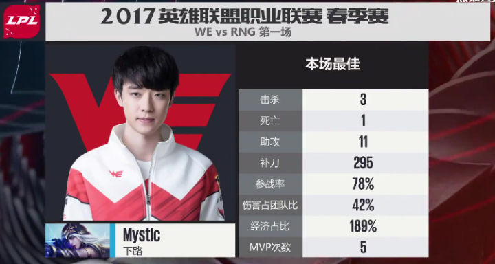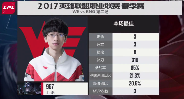 第一局双方阵容,其实如果严格按照战术安排执行,毫无疑问RNG是占优的,事实上后来WE也反复证明这套加里奥皇子配合后期ADC和输出上单的阵容只要配合得当是多么的恐怖,但此时的RNG显然还没有熟练使用,导致一个中后期打团明显优势的阵容却被各个击破,事实上河道那次之后,WE就没有让RNG找到过全员团战的机会,每次都是分割之后各个击破。UZI作为这个阵容的输出核心真是想写一个大写的惨字。 MVP给到了全场输出最高的大舅子寒冰,兮夜妖姬的团战处理也不落人后,但关键时刻表现最好的毫无疑问是河道秒掉UZI,下路单打分割RNG团战阵容,然后百步穿杨命中女警的957小鱼人。 这局比赛充分说明,至少在S7春季赛,LPL团队执行力最高的战队,就是WE。
