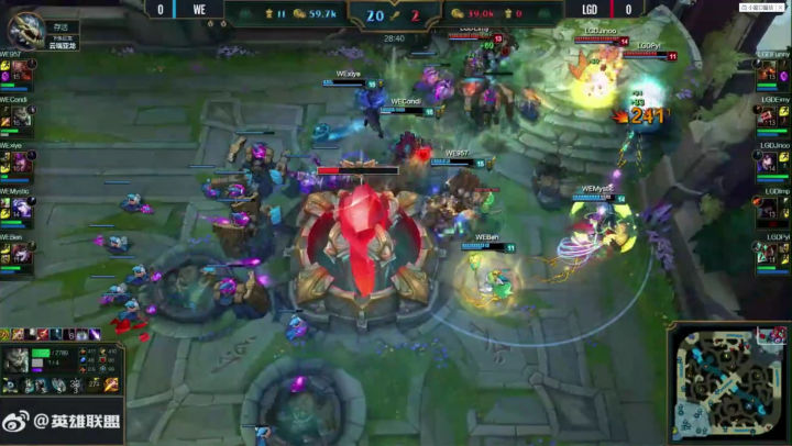 之后小虎和letme让你知道什么叫头铁,一二三四有了脾气,二二三四再来一次。依然是下路高地塔,依然是对957动刀,但这一次不同的是两个人还没等上高地,兮夜就第一时间赶到,精准的三个链子配合腿哥再次双杀对方中上铁头娃。 这一次WE不光拿下了大龙,甚至直接拿掉远古巨龙,经济反超两千。此时四保一体系彻底成型,前期没有作为的大嘴直接三件套加复活甲,成为了后期最大的BOSS。。。 虽然RNG在下路利用WE的失误和同一样输出爆炸的轮子妈来了一次一万伤害的ADC终极团战,但也是杯水车薪,从第二条大龙开始,这局比赛就RNG在团战上已经没有了和WE对拼的机会。