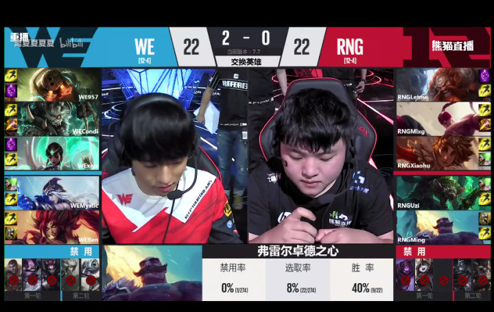 第二局RNG拿出了一个极限的前期阵容,而WE拿出了最拿手的四保一后期团战阵容。第一局用前期阵容拿下比赛之后很显然第二局WE希望能够稳妥一些。