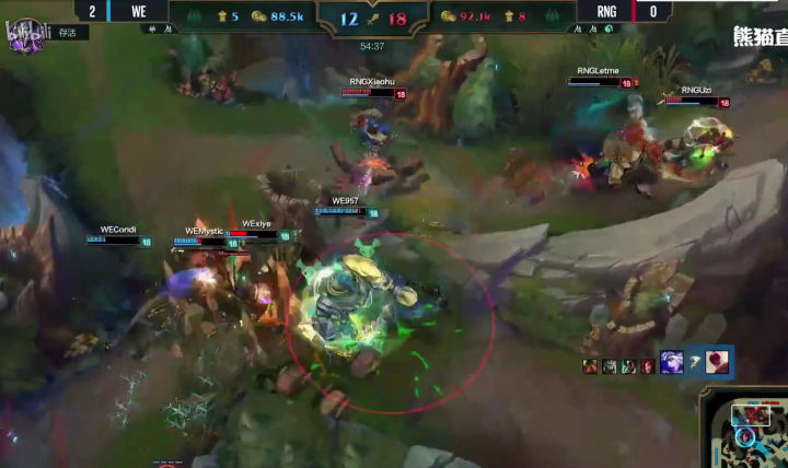 我送你离开~ 这里是两个人接连的失误。首先龙坑上的小狗在被狮子狗追到这里,闪进红BUFF距离不够了,但是完全可以闪现进队友身边,就算泰坦TP下来放大,他身边有布隆有盲僧,也完全没有危险,只是被R而已,偏偏他一个狗急跳墙,直接闪现进龙坑!明明刚刚岩雀放大的时候所有人都知道龙坑下面可都是WE的人,小狗是明知山有虎,偏向虎山行,真男人是也! 第二个失误则是RNG四个人把TP下来的957团团包围,伤害就足以灌死,偏偏盲僧一脚救死扶伤将957送出包围圈逃出生天。我反复看了好多遍慢镜头,岩雀的岩突应该第一时间就用过了,将957抬回了包围圈,这一次盲僧失误我认为应该是盲僧想走位到龙坑边然后将泰坦R到红BUFF处比较厚的墙上,形成控制,然后集火。结果走位过程中被杰拉R到,抬了一手,结果R已经按出去了,就成了一次华佗脚。 这两个失误让RNG前期的一点优势葬送了,让WE有了喘息之机。