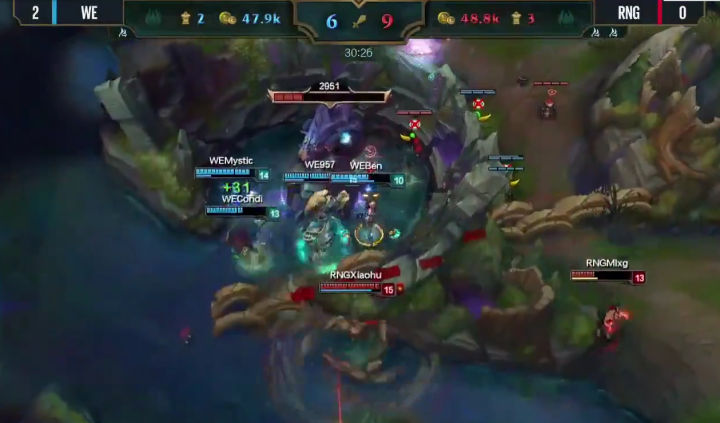 而这一波团战则是WE对自己伤害计算不足。偷龙的时候兮夜的卡尔玛独自一人在龙坑上骚扰RNG,其他四个人打大龙。其实这个时候可以让狮子狗或者泰坦一个人在上面骚扰,全伤害装的卡尔玛在下面和队友一起打大龙,还可以给脆皮加盾,狮子狗可以开大进龙坑惩戒,泰坦可以卖掉自己。结果就差这么一点血,大龙没有打掉,而复活赶来岩雀当头就是一个墙蔓,直接把WE四人全都堵在龙坑之内暴揍。WE团战失败,送掉了人头和大龙。 从这里开始,WE开始大劣势,RNG借助这条大龙一路通关WE下路高地。