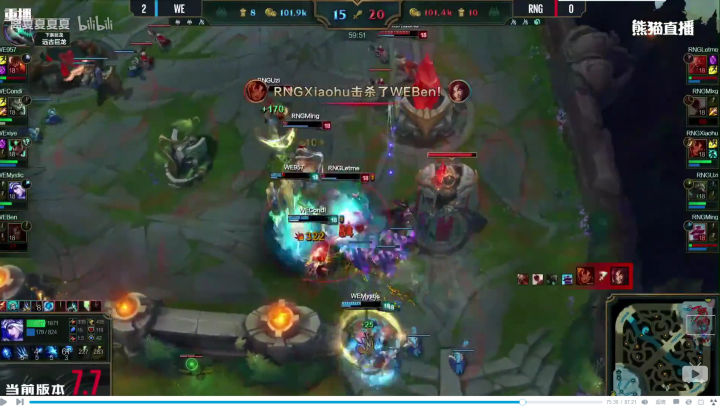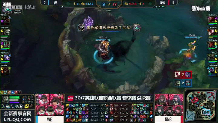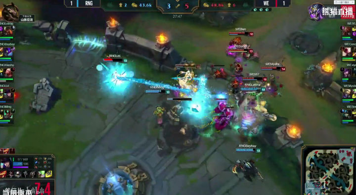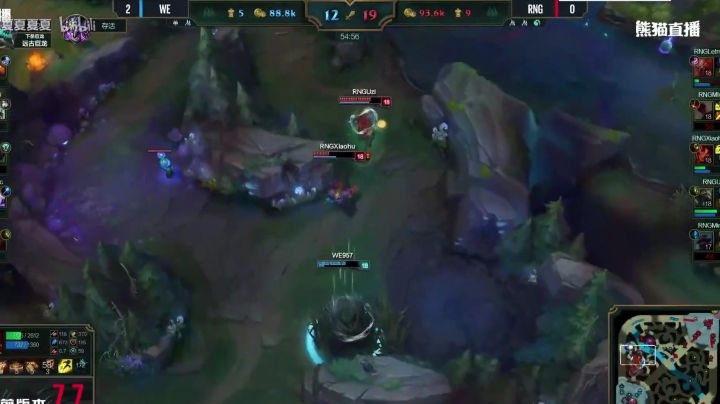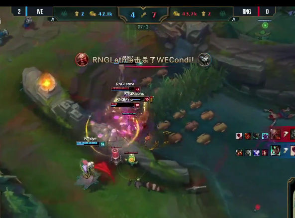 同样的配方,同样的味道,泰坦大招击飞,狮子狗大招骑脸,卡尔玛闪现给RQ。。。小狗再次暴毙。我已经不记得本场比赛WE的上中野多少次将这个套餐送给小狗了,真是特别的爱给特别的狗。。。RNG这次大龙BUFF的进攻无疾而终。