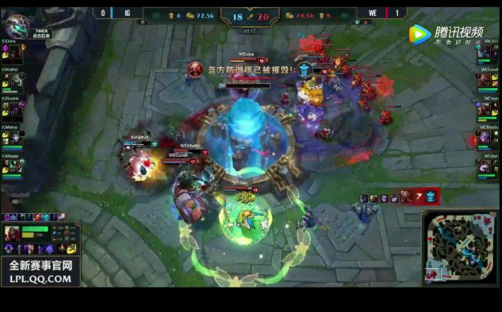 之后比这两个人还失了智的情况出现了,没有了上中两个人的情况下,RNG剩下的三个人没有选择推兵线然后大龙做眼拖延WE,等带着TP的全场发育最肥的艾克复活,而是孤注一掷去继续在高地塔纠结,希望三个人破掉有轮子妈保护的慎的高地塔,或者至少逼迫其他人来守塔。 我只能说,UZI,香锅和明这三个孩子真的*****。 结果就是WE在巨大劣势杀掉了对方中单大人头不说还直用3个人就无压力拿掉了第一个大龙。。。真是段位限制了我的想象力,看不懂你们这帮职业的在想什么。。。通过这条大龙,WE推掉下路三座塔,中路二塔和上路一塔,落后六千四的经济直接追平,并且塔数占优。