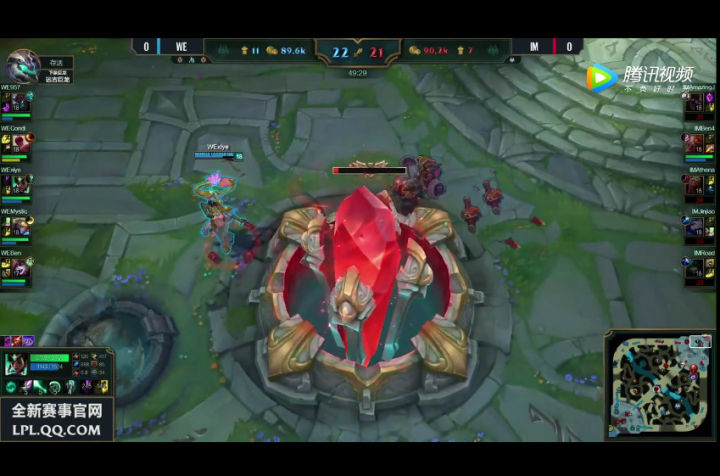 异组对抗第三场,面对去年的仇敌IM,WE第一局比赛打的有些纠结,被IM硬生生拖到了了49分钟,两边轮流拿大龙,团战交换优势,甚至WE差点被IM一波带走,但最后还是凭借着基地防守杀掉对方4个人,兮夜反一波偷基地得手拿下第一局。