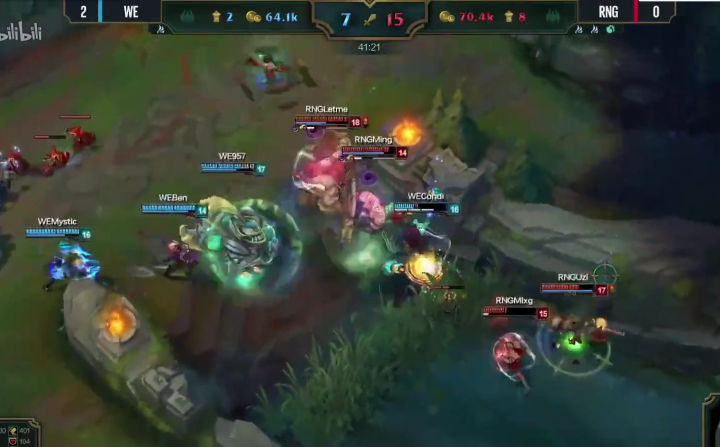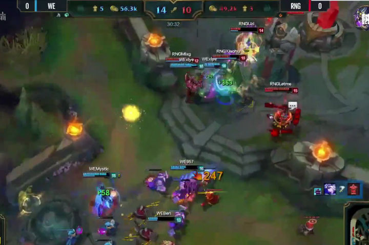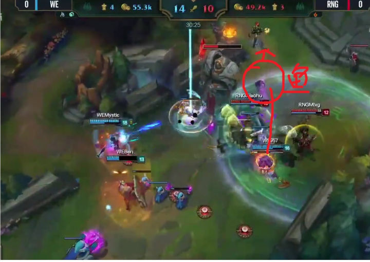 但随后锤石就被妖姬秒掉,此时战损1比2,虽然RNG因为先手的AOE拿到了优势,但WE双C俱在,血量几乎全满,大舅子此时直接进场深入RNG阵中寻找对方残血人员,配合满血957换掉了UZI,但兮夜和腿哥同时被对方集火。毕竟从阵容上来说,WE除了布隆之外几乎没有前排,三项小鱼人有持续输出和单带能力,打团其实只能算半个刺客。之后就是大舅子闪现回撤,走A躲掉对方技能,削弱血线,逼迫对方放弃继续推进。 但在被动局面下秒掉对方ADC并且保全了己方ADC,让WE获得了最大情况下的止损:中路一塔得以保全!保住中路一塔就保住了野区最前沿视野,同时让ADC在游戏中期有一个平稳发育的机会,而不会被迫去边路被压在塔下收线被抓。可以说,在中后期,中路塔是让ADC发育的最大保证。事实上WE经常上演劣势几乎被抓蹦的ADC在中路补发育后期CARRY比赛的戏码。