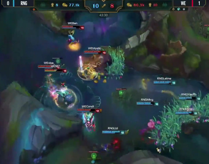 至此,WE已经形成完全的反超,并且后期阵容成型,带着双龙BUFF一波进攻高地,RNG进行最后的挣扎,盲僧再次进入敌阵希望踢回ADC,却被寒冰走位躲开,神仙阵中身亡,WE的泰坦和狮子狗一马当先盯着高地塔将RNG阵容冲的七零八落,最终只献祭辅助BEN一人情况下,其他成元残血祭击杀RNG两人,RNG下路高地告破。